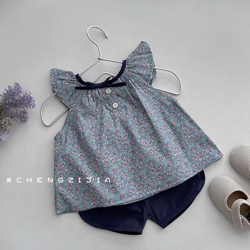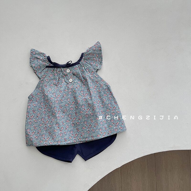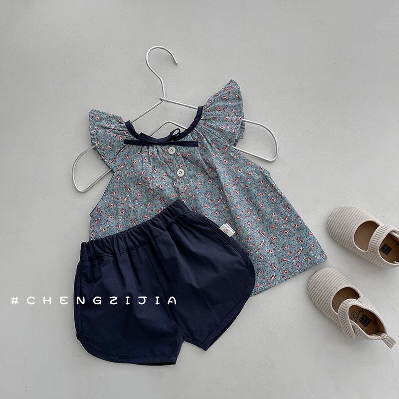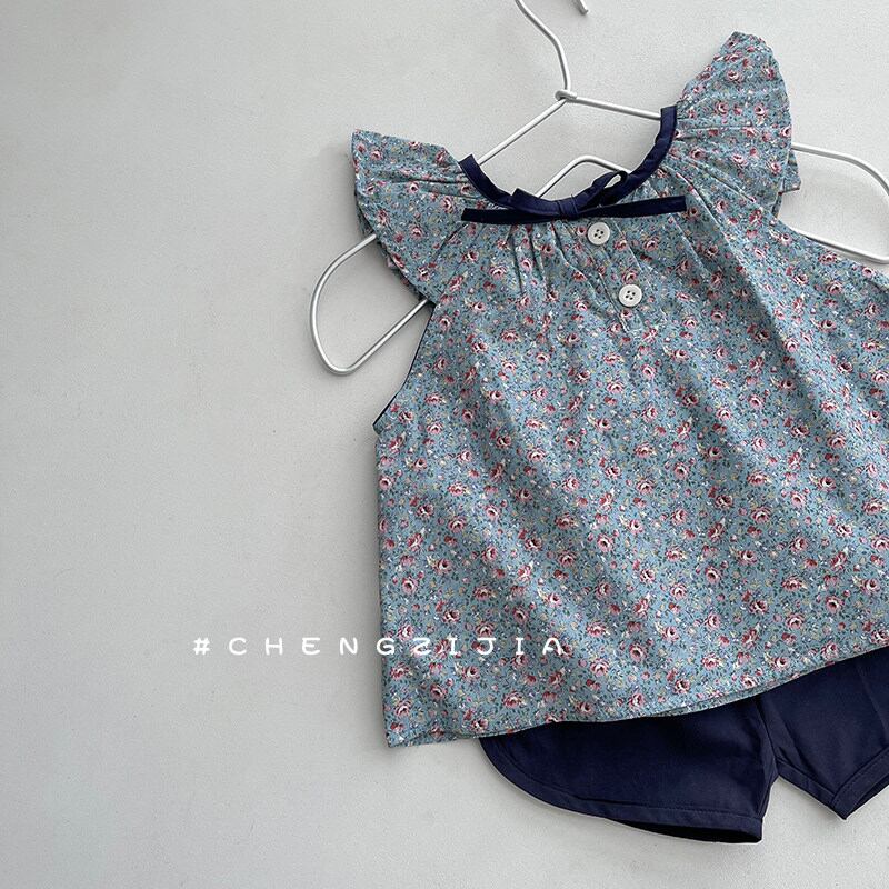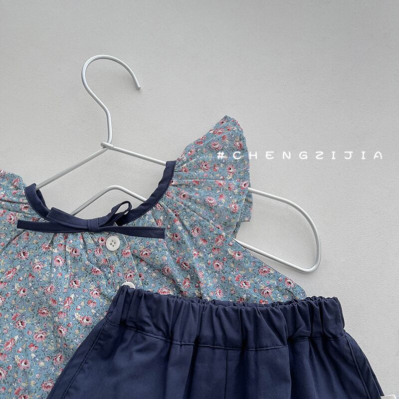 繊細な小花柄のフレアスリーブトップスとショーツのセットアップ。ナチュラルで可愛い夏のお出かけコーデに。