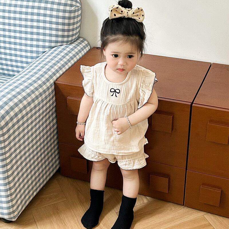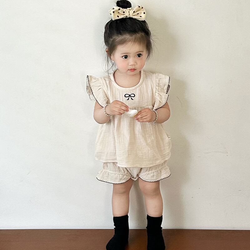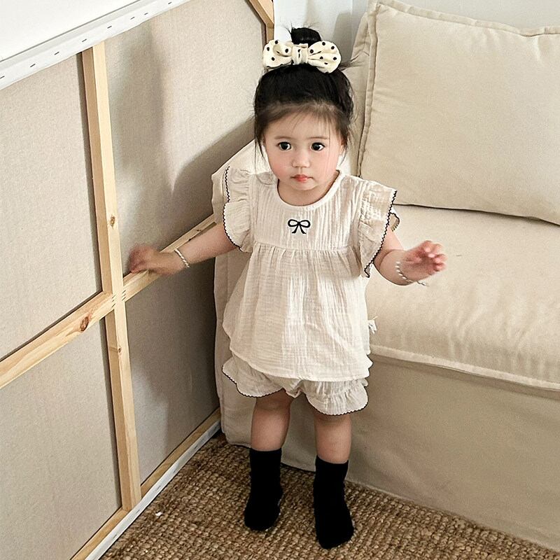 繊細なリボン刺繍のノースリーブブラウスとショーツのセットアップ。上品なスウィートスタイルに。