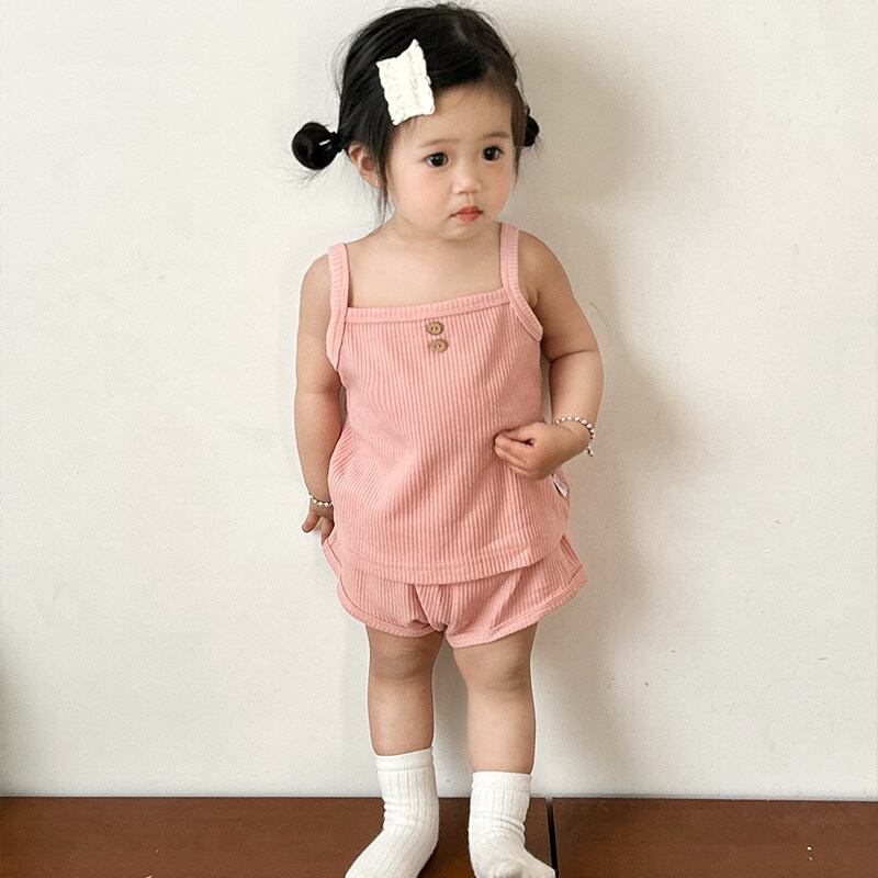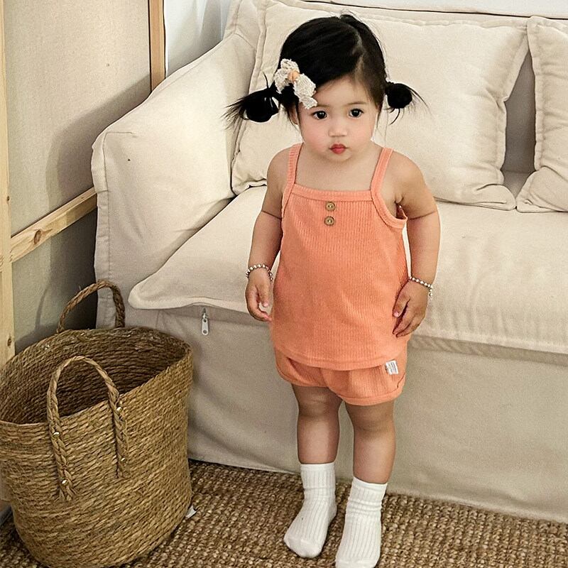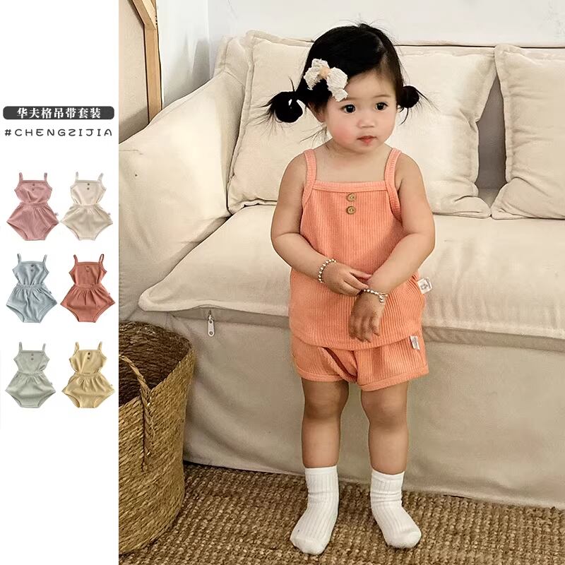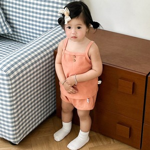 ワッフル素材のサスペンダートップとショーツのセットアップ。やわらかな肌触りでリラックスした着心地です。
