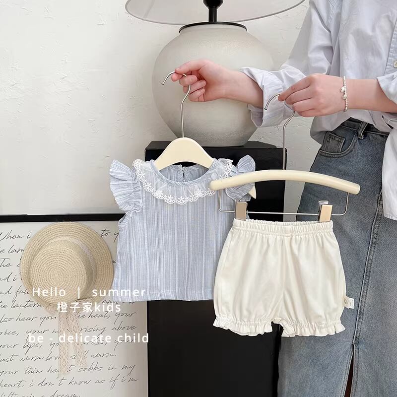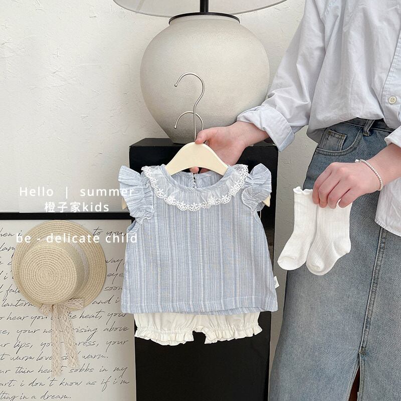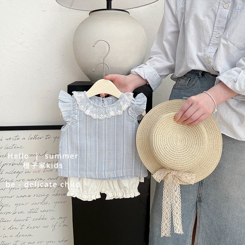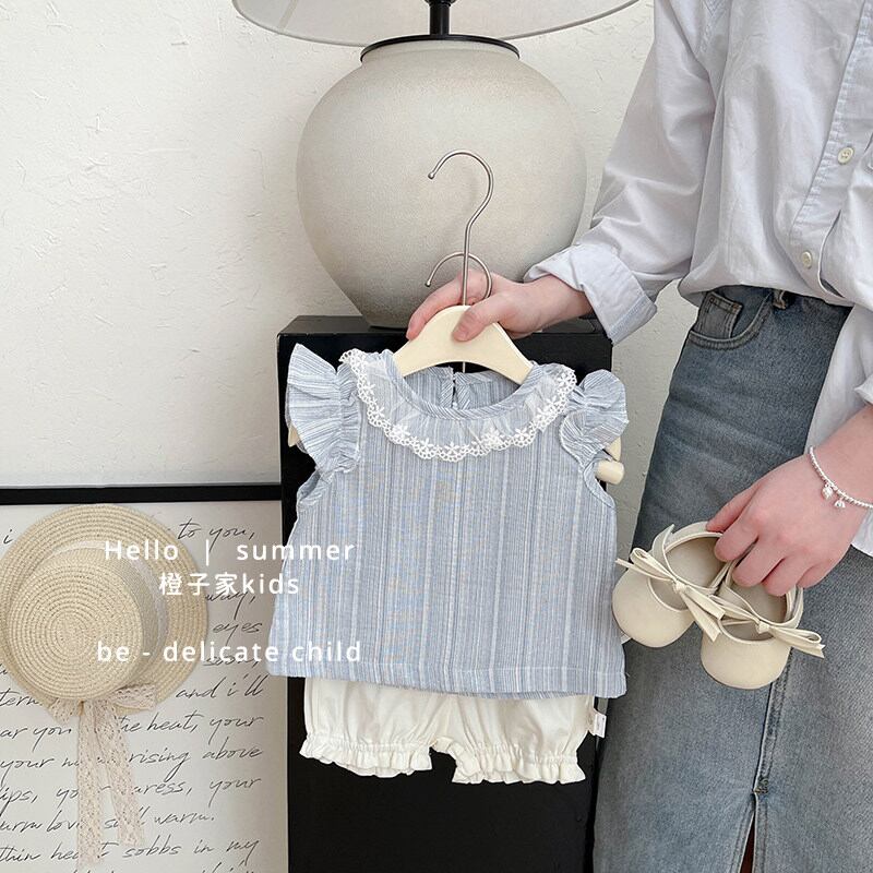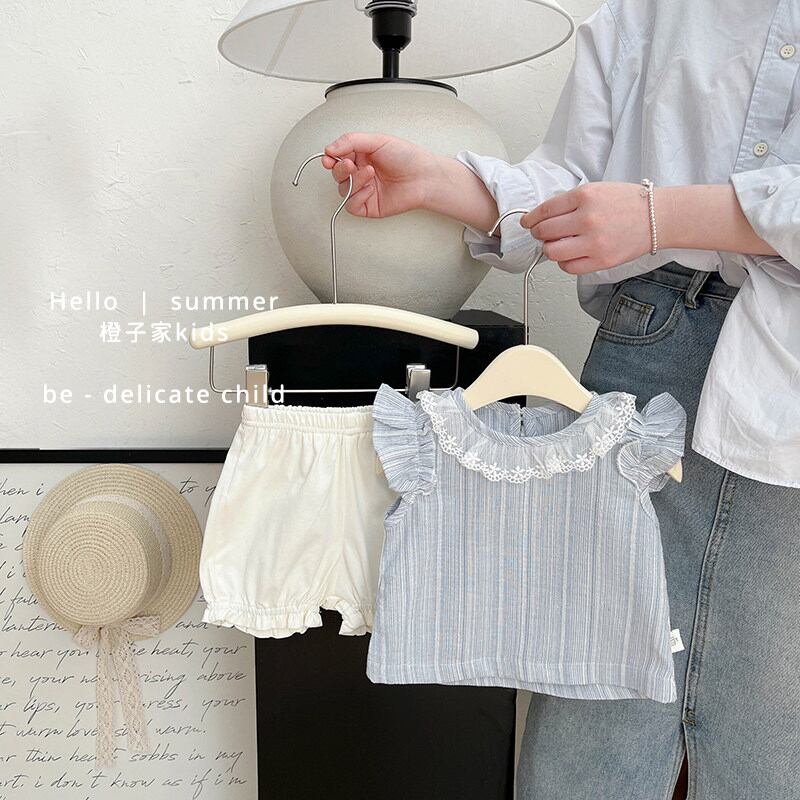 レースカラーのプリンセスフリルトップスとショーツのセット。ストライプ柄が上品なアクセントに。