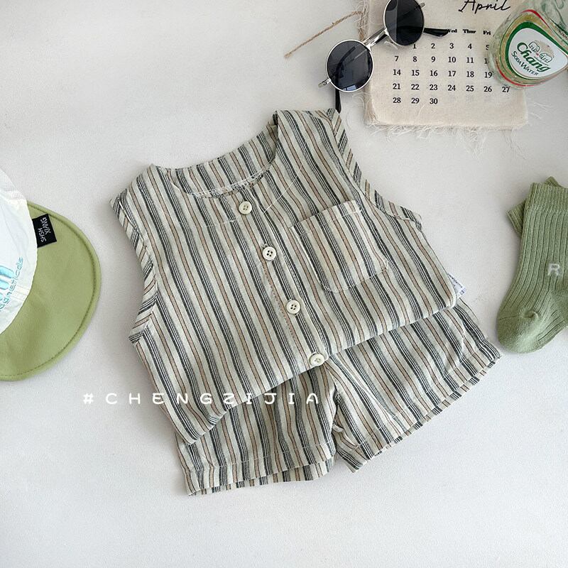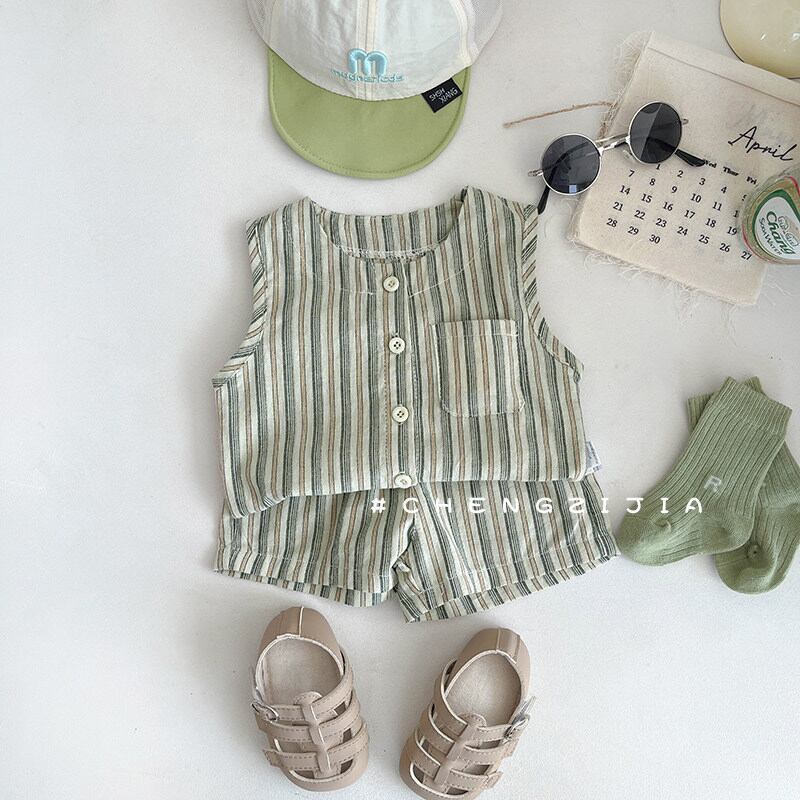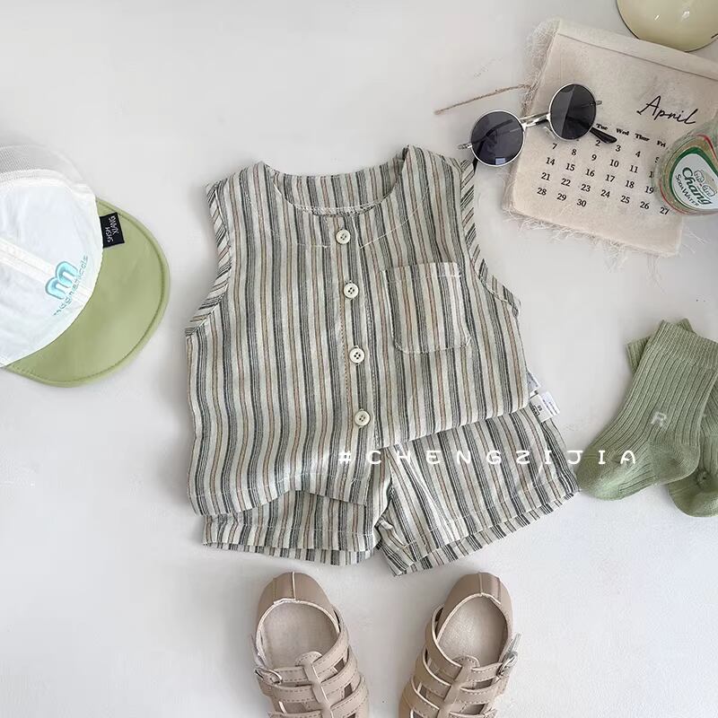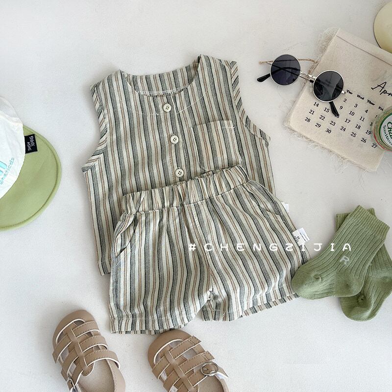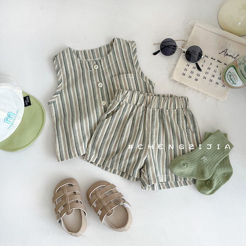 リネン風ストライプのベストとショーツの2ピースセット。ナチュラルな風合いでお出かけにぴったりです。