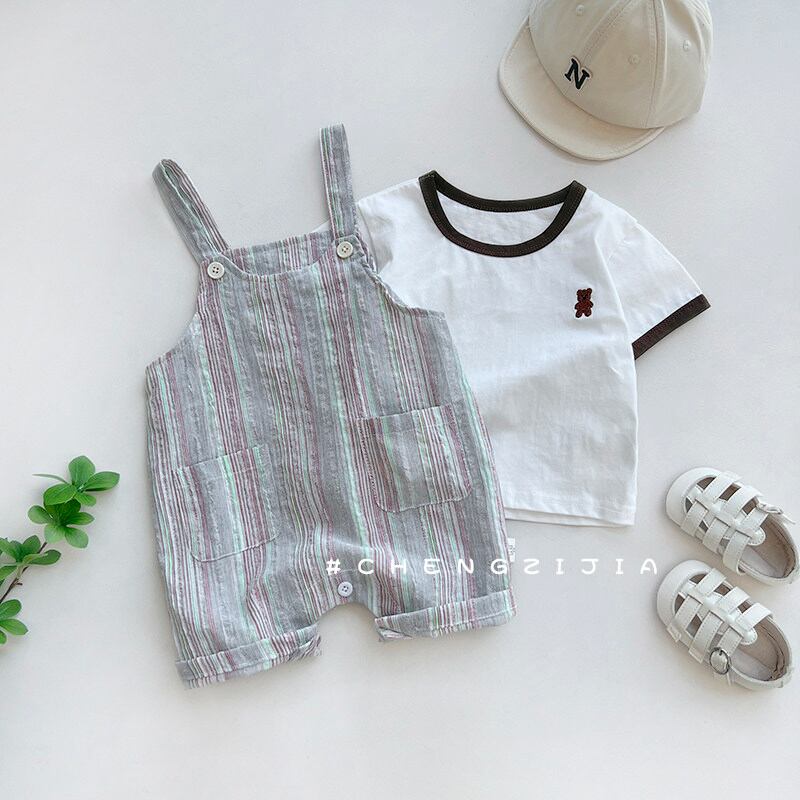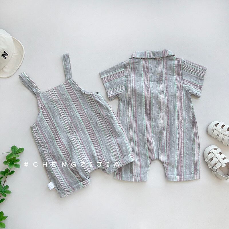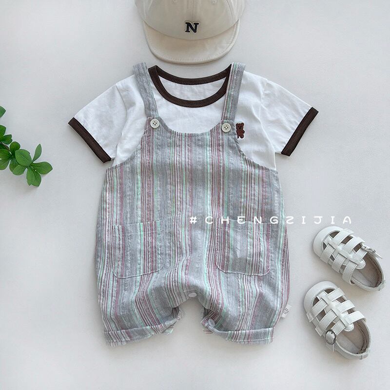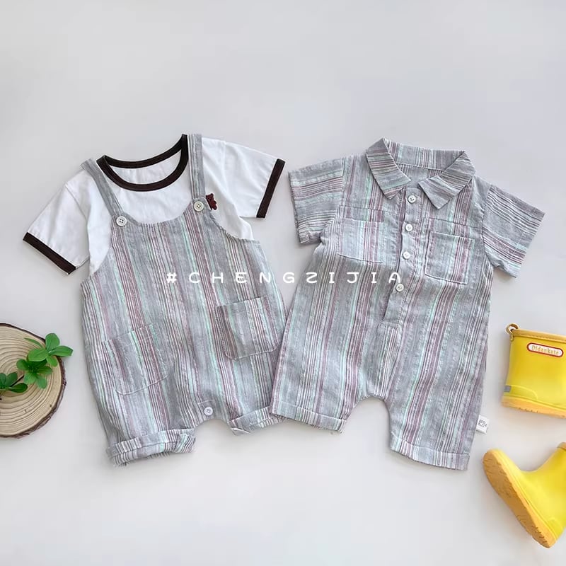 さわやかなストライプ柄の半袖ボディスーツ。カジュアルで動きやすく、夏のデイリーウェアに最適です。