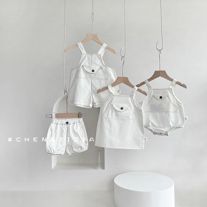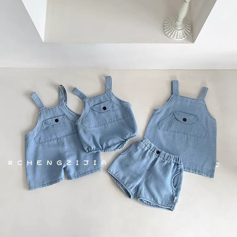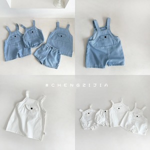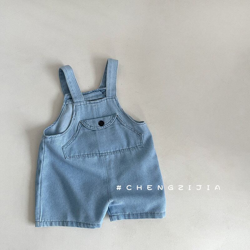 デニム素材のサスペンダーロンパース。ポケット付きでキュートなデザイン。サスペンダードレスとしても着られます。