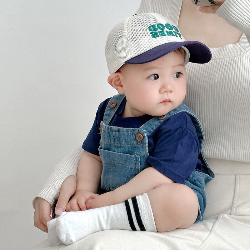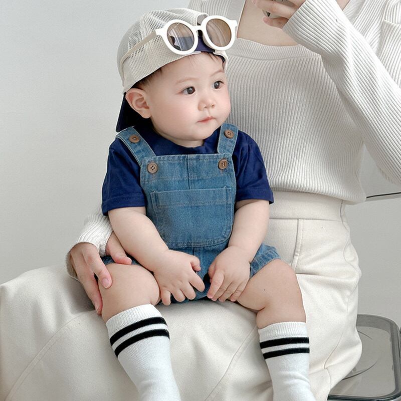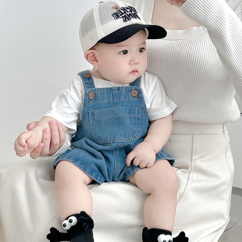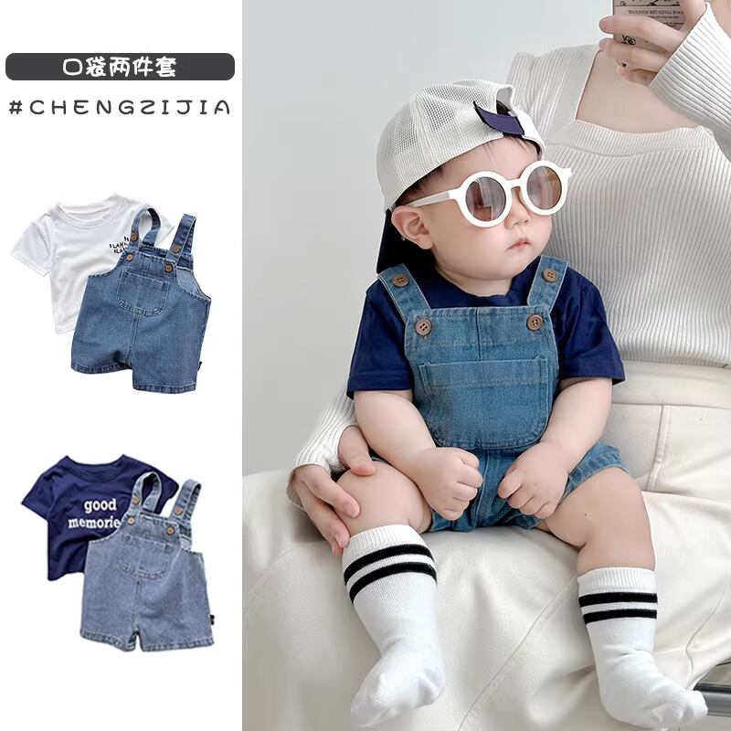 デニムビブサロペットと白い半袖Tシャツのセット。おしゃれなお出かけスタイルにぴったりです。