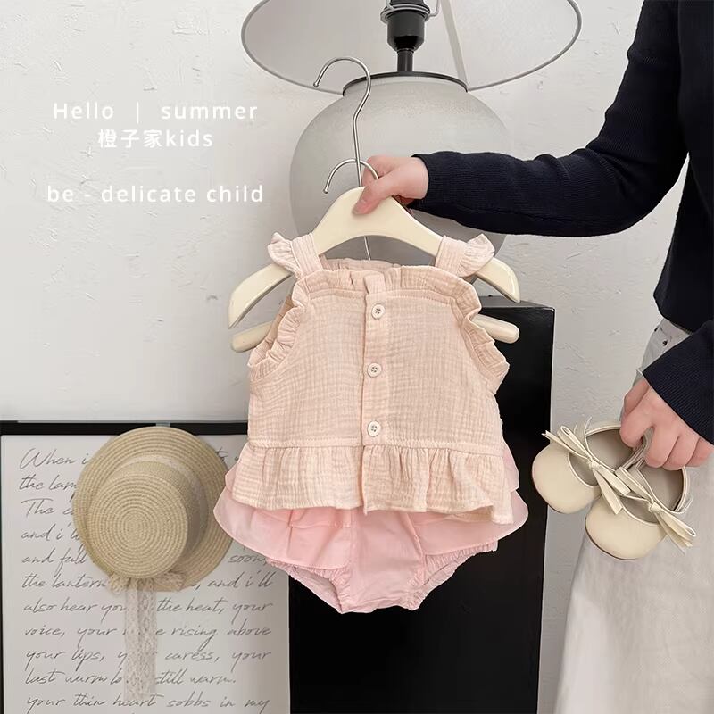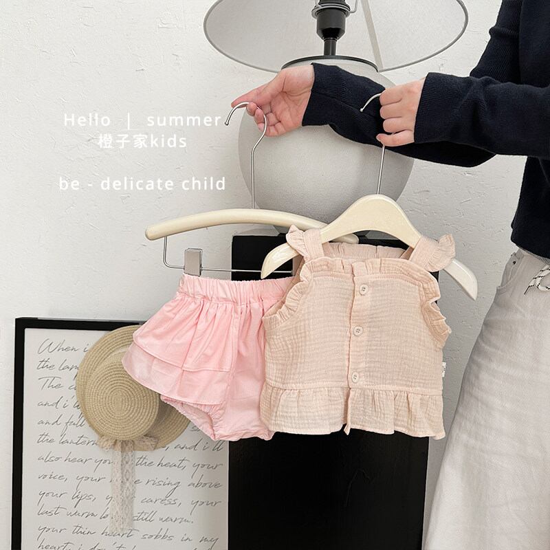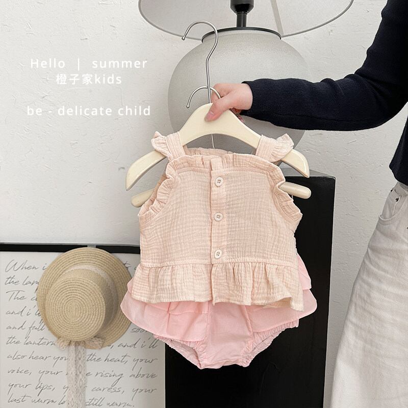 フライングスリーブのベストとスウィートショーツのセットアップ。シンプルなカラーで合わせやすいデザインです。