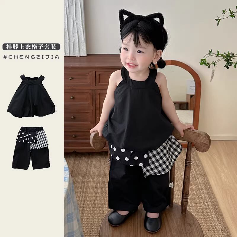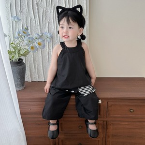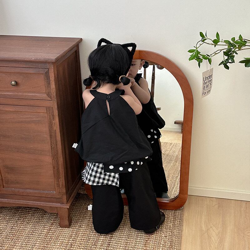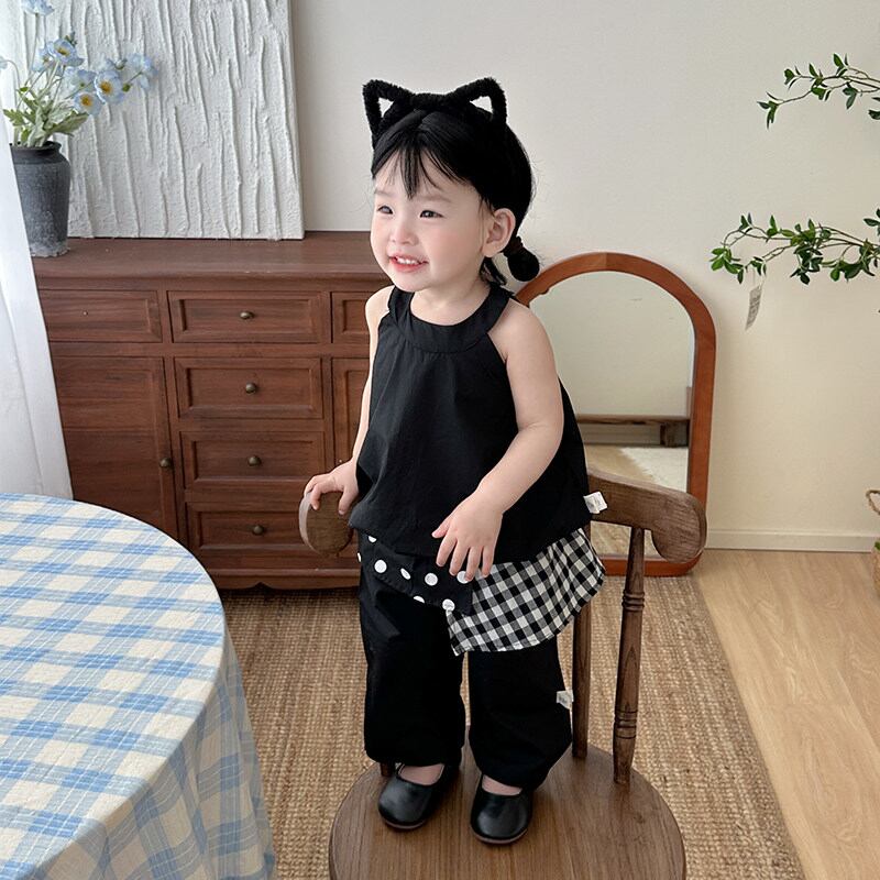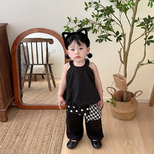 キャミソールと水玉パッチワークパンツのセット。韓国ベビー服らしいトレンド感のあるデザインです。