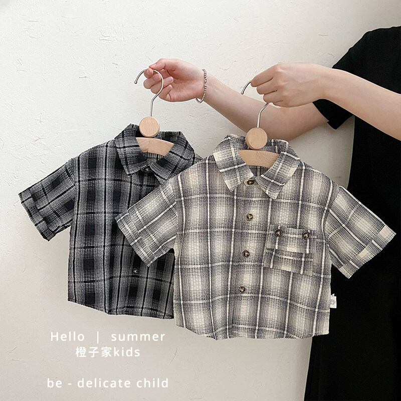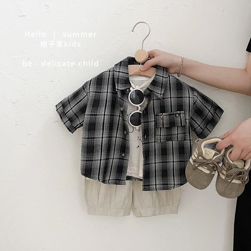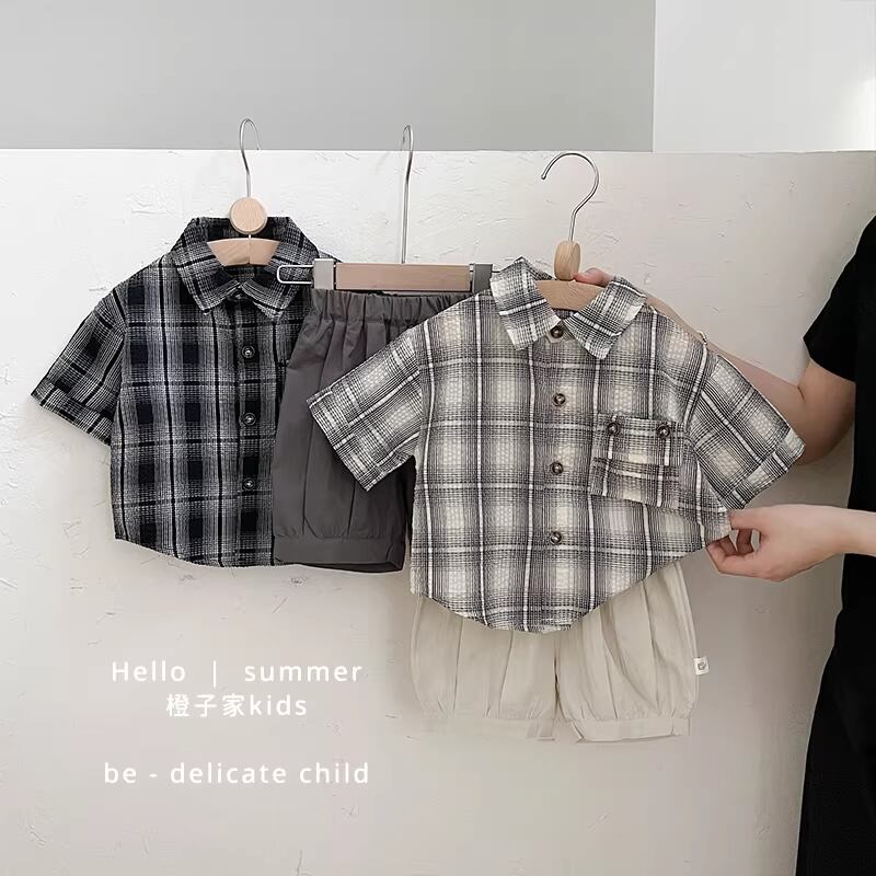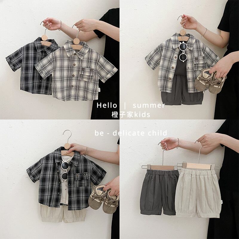 チェック柄の半袖シャツとショーツのセット。きちんと感のあるハンサムスタイルに仕上がります。